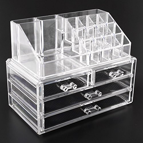 Multifunktion. Das Oberteil hat 16 Abteile in unterschiedlichen Größen, darauf können Sie Ihre Lippenstifte, Nagellacke, Kosmetikpinsel und Puderdose stellen; Das Unterteil hat drei große Schubladen, bietet Ihnen den Stauraum für Ihre Schmuckstücke und große Schminkzubehör, z.B. Lidschattens.